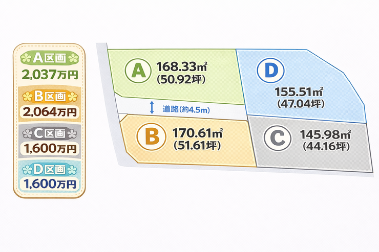 | 備考 | ■地盤調査済 ■崖地条例の定めあり ■C・D区画の有効面積は40坪となります。 ■固定資産税:23,837円~27,859円(令和7年度) |